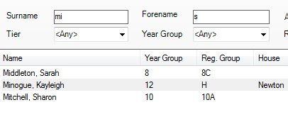 Often the drop down filters will add the ‘<Any>’ or ‘<None>’ values. Other browses may have additional special options which usually will be in angle brackets. For example the year group filter will use a pre-loaded set of year groups from the cache to display the set of available year groups and then ‘add in’ the special values.